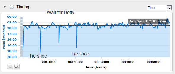 The 4 of us ran together until about 2 or 2.5 miles into it. Betty was not cooperating so then Kelly and I ran and April slowed up with Betty. I'd say she was only about 3 minutes behind us. We passed her before we even hit 5.25 miles. I'd say that's still pretty good because her previous fast times running with her dog were around 50 minutes.