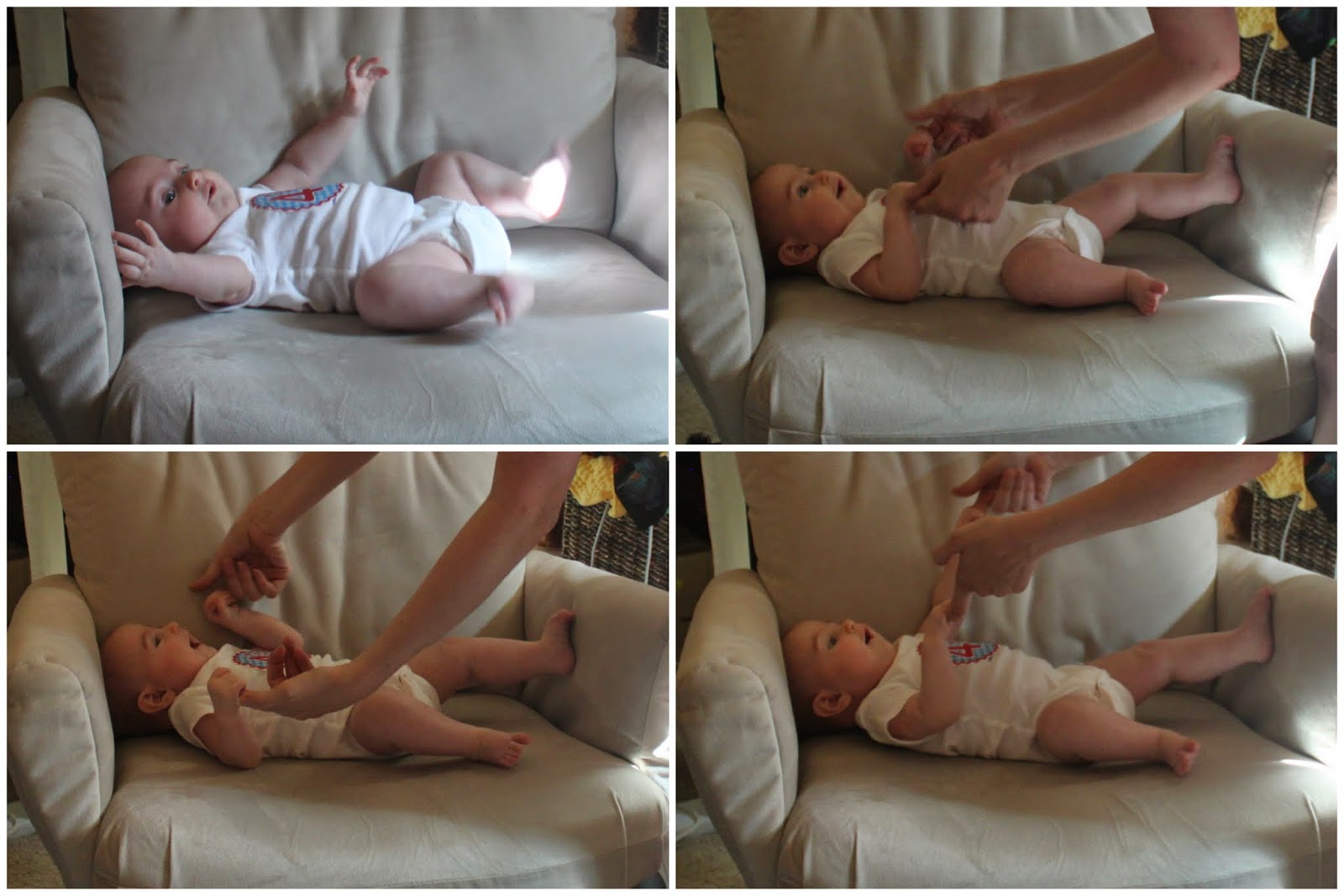 This month she started grabbing her foot and now that's one of her favorite things to do. She mainly grabs her left foot with left hand but will occasionally do the right.