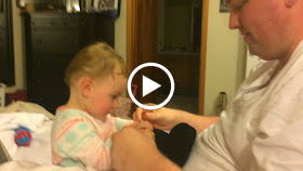 Before I fed her lunch, I cut down the other side of the curtains. They still need to be hemmed but it's a start. I was telling Ella about the issues I'm having with the curtains and even with 2 blackout curtains it's still too bright in her room. She goes to the other room and brings back the portion of the curtain that I cut off and kept trying to put that on the window too. Ella gave me a great idea. I used clothes pins and hung up the part I cut off onto the blind just how I had a t-shirt on that before. Now the top 2/3 of the window has 3 black out curtains while the bottom 1/3 has 2. It's much darker now. The light still seeps through the bottom and the bottom 1/3. I'm thinking if I actually hem the curtains too much light will come in from the bottom. I can't believe how Ella gave me this idea!