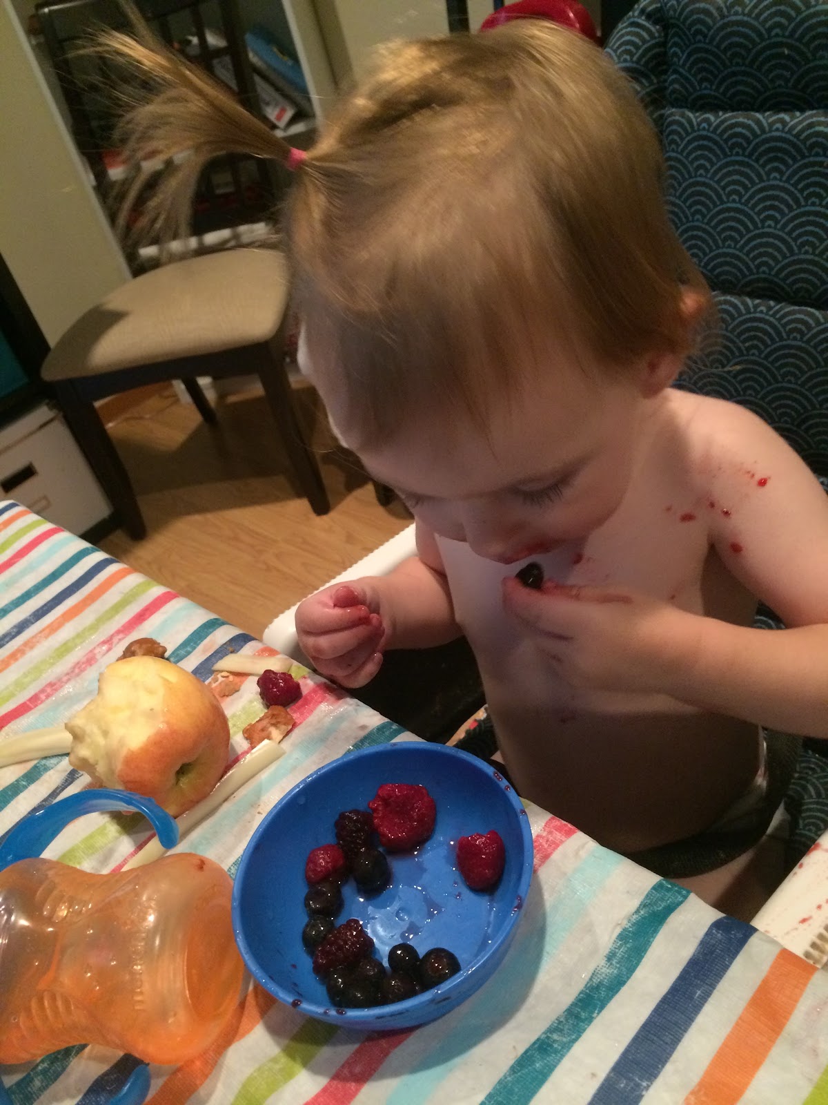 During nap I was able to eat and clean. Then Brenna was over for the stampin' up class. She had to leave early and didn't get to finish. She was also late. We would have finished if she wasn't late. Minutes after she left, Ella woke up. Ella was playing in her crib after for about 20 minutes before I went in. She was pretty pleasant after nap. We called my mom on a hangout. We talked a bit. Ella ate. Ella got so messy from fruit. The fruit was frozen that I ran under water to thaw a bit. Ella loved it but that water made it messier. I gave her a quick bath and then we had company. Brenna finished her last card and hung out with Ella for a little. Ella was afraid of Dan. She is afraid of men lately.