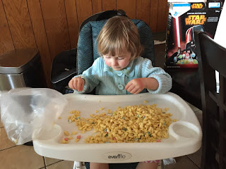 Ella got her own cereal. She didn't do it quite right.